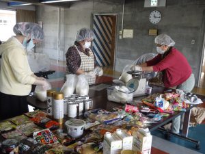 食品募集に際しましては、皆様にたくさんの食品の寄付の御協力をいただきありがとうございました。ご協力いただいた食品の配布準備を、地域食堂(みんな食堂)を実施するボランティア3団体と行い、様々な食品が混ざっておりますが、合計100セットできました。